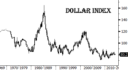 Мировая экономика находится в начале долгосрочного цикла роста доллара, подобно тому, что наблюдался в первой половине 80-ых и второй половине 90-ых. На графике индекса доллара (отражает курс доллара к корзине валют) видно, что по историческим меркам движение по индексу на 25% вверх, с текущих 80 до 100 не будет представлять из себя ничего примечательного, ведь в 2000 году индекс поднимался до отметки 120.