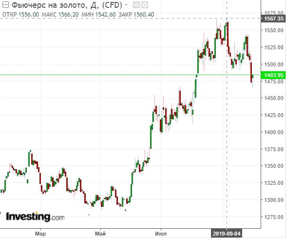 На фоне этого, мы видим падение по золоту, коррекцию на более чем 5 процентов от максимальных значений. Тоже мне, защитный инструмент.
